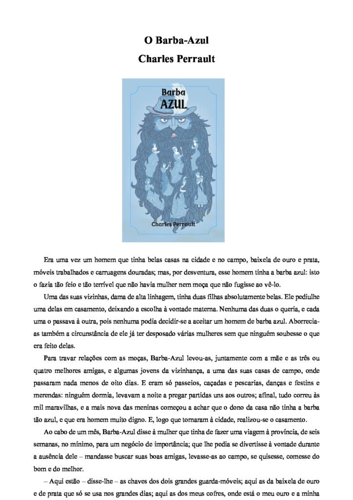 O Barba-Azul Charles Perrault Era uma vez um homem que tinha belas casas na cidade e no campo, baixela de ouro e prata, móveis trabalhados e carruagens douradas; mas, por desventura, esse homem tinha a barba azul: isto o fazia tão feio e tão terrível que não havia mulher nem moça que não fugisse ao vê-lo. Uma das suas vizinhas, dama de alta linhagem, tinha duas filhas absolutamente belas. Ele pediulhe uma delas em casamento, deixando a escolha à vontade materna. Nenhuma das duas o queria, e cada uma o passava à outra, pois nenhuma podia decidir-se a aceitar um homem de barba azul. Aborreciaas também a circunstância de ele já ter desposado várias mulheres sem que ninguém soubesse o que era feito delas. Para travar relações com as moças, Barba-Azul levou-as, juntamente com a mãe e as três ou quatro melhores amigas, e algumas jovens da vizinhança, a uma das suas casas de campo, onde passaram nada menos de oito dias. E eram só passeios, caçadas e pescarias, danças e festins e merendas: ninguém dormia, levavam a noite a pregar partidas uns aos outros; afinal, tudo correu às mil maravilhas, e a mais nova das meninas começou a achar que o dono da casa não tinha a barba tão azul, e que era homem muito digno. E, logo que tornaram à cidade, realizou-se o casamento. Ao cabo de um mês, Barba-Azul disse à mulher que tinha de fazer uma viagem à província, de seis semanas, no mínimo, para um negócio de importância; que lhe pedia se divertisse à vontade durante a ausência dele – mandasse buscar suas boas amigas, levasse-as ao campo, se quisesse, comesse do bom e do melhor. – Aqui estão – disse-lhe – as chaves dos dois grandes guarda-móveis; aqui as da baixela de ouro e de prata que só se usa nos grandes dias; aqui as dos meus cofres, onde está o meu ouro e a minha prata, as dos cofres de minhas jóias e aqui a chave de todas as dependências da casa. Esta chavezinha é a chave do gabinete que fica no extremo da grande galeria da cave: pode abrir tudo, pode ir aonde quiser, mas neste pequeno gabinete eu proíbo-a de entrar, e proíbo de tal maneira que, se acontecer abri-lo, não há nada que não possa esperar da minha cólera. Ela prometeu cumprir à risca tudo quanto acabava de ser ordenado: e ele, depois de beijá-la, tomou sua carruagem e partiu. As vizinhas e as boas amigas não esperaram, para ir à residência da jovem esposa, que as mandassem buscar, tão sôfregas estavam de ver-lhe todas as riquezas da casa, não havendo ousado ir lá enquanto o marido se achava por causa da sua barba azul, que lhes fazia medo. E ei-las, sem perda de tempo, a percorrer os quartos, gabinetes, vestiários, cada um mais belo que os outros. Subiram depois aos guarda-móveis, onde não se cansavam de admirar o número e a beleza das tapeçarias, dos leitos, dos sofás, dos guarda-roupas, dos veladores, das mesas e dos espelhos, nos quais a gente se via da cabeça aos pés, e cujos ornatos, uns de vidro, outros de prata, ou de prata dourada, eram os mais belos e magníficos que já se poderiam ter visto. Não cessavam de exagerar e invejar a felicidade da amiga, a quem, no entanto, não alegravam todas essas riquezas, ansiosa que estava de abrir o gabinete da cave. Sentiu-se tão premida pela curiosidade que, sem reflectir que era uma indelicadeza deixar sozinhas as visitas, desceu até lá por uma escadinha oculta, e com tamanha precipitação que por duas ou três vezes pensou em quebrar o pescoço. Chegando à porta do gabinete, aí se deteve algum tempo, lembrando-se da proibição que o marido lhe fizera e considerando que lhe poderia acontecer uma desgraça por haver sido desobediente; mas a...